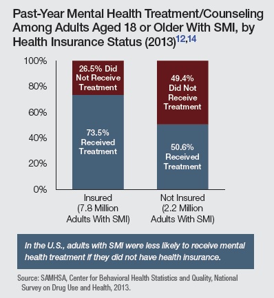 the percentage of individual’s who received mental health treatment was substantially less for those who were not insured (and were likely to need it the most).