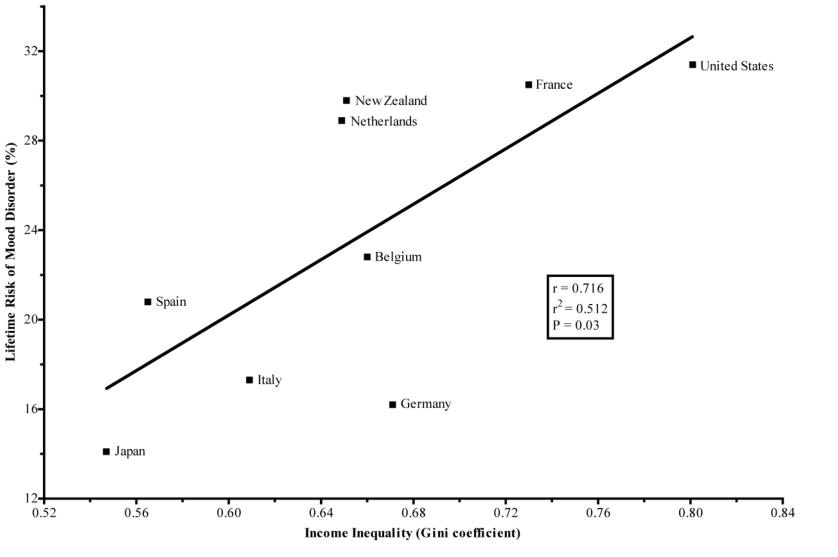 Depression as a disease of modernity: explanations for increasing prevalence (Journal of Affective Disorders) explores questions as to whether depression rates have increased, and reviews evidence for possible explanations; including as suggested in the chart below, the increase in income inequality, as well as an increase in gross domestic product. The article concludes that future research and policy interventions are needed to address this public health crisis.